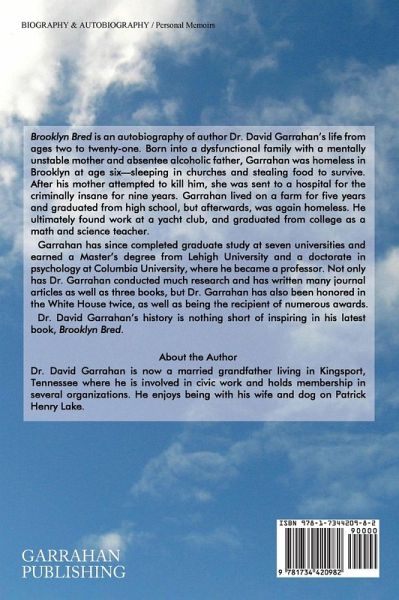 Brooklyn Bred is an autobiography of author Dr. David Garrahan's life from ages two to twenty-one. Born into a dysfunctional family with a mentally unstable mother and absentee alcoholic father, Garrahan was homeless in Brooklyn at age six-sleeping in churches and stealing food to survive. After his mother attempted to kill him, she was sent to a hospital for the criminally insane for nine years. Garrahan lived on a farm for five years and graduated from high school, but afterwards, was again homeless. He ultimately found work at a yacht club, and graduated from college as a math and science teacher. Garrahan has since completed graduate study at seven universities and earned a Master's degree from Lehigh University and a doctorate in psychology at Columbia University, where he became a professor. Not only has Dr. Garrahan conducted much research and has written many journal articles as well as three books, but Dr. Garrahan has also been honored in the White House twice, as well as being the recipient of numerous awards. Dr. David Garrahan's history is nothing short of inspiring in his latest book, Brooklyn Bred.