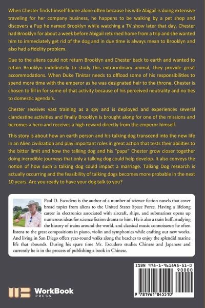 When Chester finds himself home alone often because his wife Abigail is doing extensive traveling for her company business, he happens to be walking by a pet shop and discovers a Pup he named Brooklyn while watching a TV show later that day. Chester had Brooklyn for about a week before Abigail returned home from a trip and she wanted him to immediately get rid of the dog and in due time is always mean to Brooklyn and also had a fidelity problem. Due to the aliens could not return Brooklyn and Chester back to earth and wanted to retain Brooklyn indefinitely to study this extraordinary animal, they provide great accommodations. When Duke Tinktar needs to offload some of his responsibilities to spend more time with the emperor as he was designated heir to the throne, Chester is chosen to fill in for some of that activity because of his perceived neutrality and no ties to domestic agenda's. Chester receives vast training as a spy and is deployed and experiences several clandestine activities and finally Brooklyn is brought along for one of the missions and becomes a hero and receives a high reward directly from the emperor himself. This story is about how an earth person and his talking dog transcend into the new life in an Alien civilization and play important roles in great action that tests their abilities to the bitter limit and how the talking dog and his "papa" Chester grow closer together doing incredible journeys that only a talking dog could help develop. It also conveys the notion of how such a talking dog could impact a marriage. Talking Dog research is actually occurring and the feasibility of talking dogs becomes more probable in the next 10 years. Are you ready to have your dog talk to you?