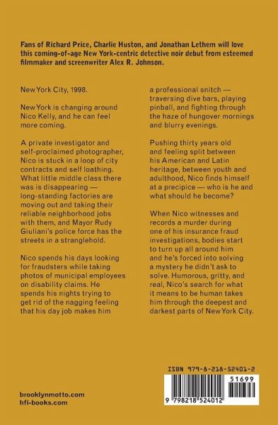 "Brooklyn Motto is a stylish, propulsive mystery that beautifully captures late 90s New York City in the convulsions of enormous social and economic change. Alex Johnson combines novelistic texture with cinematic pace to great effect, and narrator Nico Kelly is the perfect guide to this world full of danger, corruption, and also hope." - Sam Lipsyte, author of No One Left to Come Looking for You "Alex R. Johnson's playful, witty, brooding, and heartfelt Brooklyn Motto is everything readers of classic private detective fiction could want - but placed in the nothing-like-classic East Village and Brooklyn of 1998. Brimming with distinctive characters, clever language, and crisp observations, the book is a thoroughly engaging and deeply satisfying read. I tore through it and had a lot of fun." - Evan Handler, actor; author of Time On Fire: A Comedy of Terrors and It's Only Temporary: The Good News and the Bad News of Being Alive "[Brooklyn Motto] is an inventive hard-boiled mash-up starring a reluctant GenX PI who accidentally finds himself in way over his head. His backstory and future relies on a complicated extended family and their immigrant Brooklyn culture. A love letter to NYC & detective fiction." - John Doe (X), musician, actor and author of Under the Big Black Sun: A Personal History of L.A. Punk and More Fun in the New World: The Unmaking and Legacy of L.A. Punk -- Fans of Richard Price, Charlie Huston, and Jonathan Lethem will love this coming-of-age New York-centric detective noir debut from esteemed filmmaker and screenwriter Alex R. Johnson. New York City, 1998. New York is changing around Nico Kelly, and he can feel more coming. A private investigator and self-proclaimed photographer, Nico is stuck in a loop of city contracts and self loathing. What little middle class there was is disappearing-long-standing factories are moving out and taking their reliable neighborhood jobs with them, and Mayor Rudy Giuliani's police force has the streets in a stranglehold. Nico spends his days looking for fraudsters while taking photos of municipal employees on disability claims. He spends his nights trying to get rid of the nagging feeling that his day job makes him a professional snitch-traversing dive bars, playing pinball, and fighting through the haze of hungover mornings and blurry evenings. Pushing thirty years old and feeling split between his American and Latin heritage, between youth and adulthood, Nico finds himself at a precipice-who is he and what should he become? When Nico witnesses and records a murder during one of his insurance fraud investigations, bodies start to turn up all around him and he's forced into solving a mystery he didn't ask to solve. Humorous, gritty, and real, Nico's search for what it means to be human takes him through the deepest and darkest parts of New York City.