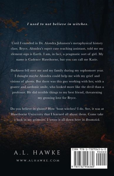 I used to not believe in witches. Until I enrolled in Dr. Alondra Johansen's metaphysical history class. Bryce, Alondra's super cute teaching assistant, told me my element sign is Earth. I am, in fact, a pragmatic sort of girl. My name is Cadence Hawthorne, but you can call me Katie. Darkness fell over me and my family during my sophomore year. I thought maybe Alondra could help me with my grief and visions of ghosts. But there was this guy working with her, with a goatee and sardonic smile, who looked more like the devil than a professor. He did terrible things to my best friend, threatening my growing love for Bryce. Do you believe in ghosts? How 'bout witches? I do. See, it was at Hawthorne University that I learned all about them. Come take a look in my grimoire. I wrote it all down here in Broomstick.