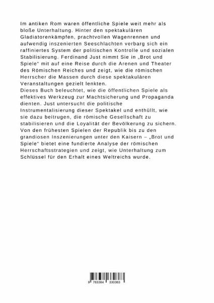 Im antiken Rom waren öffentliche Spiele weit mehr als bloße Unterhaltung. Hinter den spektakulären Gladiatorenkämpfen, prachtvollen Wagenrennen und aufwendig inszenierten Seeschlachten verbarg sich ein raffiniertes System der politischen Kontrolle und sozialen Stabilisierung. Ferdinand Just nimmt Sie in "Brot und Spiele" mit auf eine Reise durch die Arenen und Theater des Römischen Reiches und zeigt, wie die römischen Herrscher die Massen durch diese spektakulären Veranstaltungen gezielt lenkten.Dieses Buch beleuchtet, wie die öffentlichen Spiele als effektives Werkzeug zur Machtsicherung und Propaganda dienten. Just untersucht die politische Instrumentalisierung dieser Spektakel und enthüllt, wie sie dazu beitrugen, die römische Gesellschaft zu stabilisieren und die Loyalität der Bevölkerung zu sichern. Von den frühesten Spielen der Republik bis zu den grandiosen Inszenierungen unter den Kaisern - "Brot und Spiele" bietet eine fundierte Analyse der römischen Herrschaftsstrategien und zeigt, wie Unterhaltung zum Schlüssel für den Erhalt eines Weltreichs wurde.
