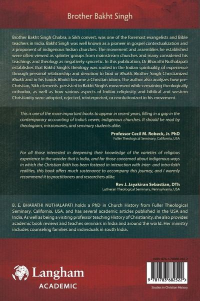 Brother Bakht Singh Chabra, a Sikh convert, was one of the foremost evangelists and Bible teachers in India. Bakht Singh was well known as a pioneer in gospel contextualization and a proponent of indigenous Indian churches. The movement and assemblies he established were often viewed as splinter groups from mainstream churches and many considered his teachings and theology as negatively syncretic. In this publication, Dr Bharathi Nuthalapati establishes that Bakht Singh's theology was rooted in the Indian spirituality of experience through personal relationship and devotion to God or Bhakti. Brother Singh Christianized Bhakti and in his hands Bhakti became a Christian idiom. The author also analyzes how pre-Christian, Sikh elements persisted in Bakht Singh's movement while remaining theologically orthodox, as well as how various aspects of Indian religiosity and biblical and western Christianity were adopted, rejected, reinterpreted, or revolutionized in his movement.