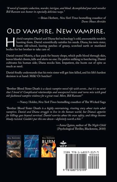 win Vampires. Different motives to kill. Hybrid vampires Daniel and Diana feel technology's cold, uncountable tendrils hunting them. Daniel scientifically satisfies his needs. Diana, his twin sister, hunts in the old-school way, leaving patches of greasy, scorched earth or mutilated bodies for her brother to take care of. Daniel created Matrix, a face pack for beauty shops, which pulls blood through skin, leaves blissful clients, kills and alerts no one. Daniel cultivates his human side; Diana mocks him. Impatient, she hunts out of spite as much as need. Admitting to himself that his twin sister will get him killed, Daniel knows that life's hardest decision is at hand. "A novel of vampire seduction, murder, intrigue, and blood. Accomplished poet and novelist Bill Ransom uses humor in especially delicious ways."-Brian Herbert, New York Times bestselling coauthor of Dune: House Atreides "Brother Blood Sister Death is a classic vampire novel rife with secrets...but it's no secret that I loved it! Complicated relationships and unexpected twists and turns mix with good old-fashioned vampire violence for a great read. More Bill Ransom!"-Nancy Holder, New York Times bestselling coauthor of The Wicked Saga