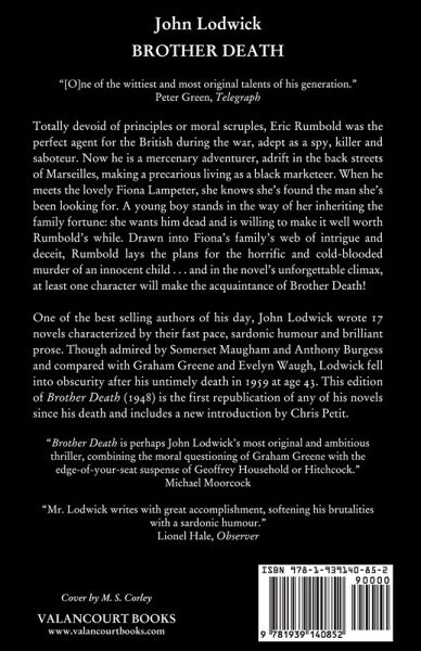 "Brother Death is perhaps John Lodwick's most original and ambitious thriller, combining the moral questioning of Graham Greene with the edge-of-your-seat suspense of Geoffrey Household or Hitchcock." - Michael Moorcock "Mr. Lodwick writes with great accomplishment, softening his brutalities with a sardonic humour." - Lionel Hale, Observer "Mr. Lodwick is a clever writer who goes all out to be tough. It should gratify him to hear that this reviewer thinks Brother Death a perfectly horrid book, for he can hardly have meant it to be anything else.... there is no denying that Mr. Lodwick's style is admirable, that he can make a point with the minimum of words and can be very good company." - Guardian "[O]ne of the wittiest and most original talents of his generation." - Peter Green, Telegraph "Mr. Lodwick is one of the few true craftsmen writing in English." - The Observer "John Lodwick has a richness of invention and a command of words equal to Evelyn Waugh." - Daily Herald Eric Rumbold is a mercenary adventurer, adrift in the back streets of Marseilles, where he makes a precarious living as a counterfeiter and black marketeer. Totally lacking either principles or moral scruples, Rumbold had been a top spy, saboteur, and killer for the British during the war but finds his talents of little use in peacetime. When the alluring Fiona Lampeter meets Rumbold, she knows she's found the man she's been looking for. Her young son stands in the way of her inheriting the family fortune: she wants the boy dead and is willing to make the job well worth Rumbold's while. Drawn into the Lampeter family's web of intrigue and deceit, Rumbold lays the plans for the horrific and cold-blooded murder of an innocent child ... and in the novel's unforgettable climax, at least one of them will make the acquaintance of Brother Death. One of the best selling authors of his day, John Lodwick's novels were characterized by their fast pace, sardonic humour, and brilliant prose. Admired by Somerset Maugham, John Betjeman, and Anthony Burgess, and often compared with Graham Greene and Evelyn Waugh, Lodwick fell into obscurity after his death in a car crash in 1959 at age 43. This edition of Brother Death (1948) is the first republication of any of his works since his death and includes a new introduction by Chris Petit.