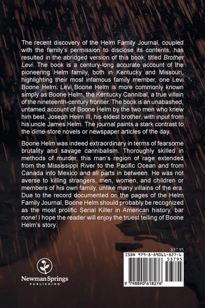 The recent discovery of the Helm Family Journal, coupled with the family's permission to disclose its contents, has resulted in the abridged version of this book, titled Brother Levi. The book is a century-long accurate account of the pioneering Helm family, both in Kentucky and Missouri, highlighting their most infamous family member, one Levi Boone Helm. Levi Boone Helm is more commonly known simply as Boone Helm, the Kentucky Cannibal, a true villain of the nineteenth-century frontier. The book is an unabashed, untamed account of Boone Helm by the two men who knew him best, Joseph Helm III, his eldest brother, with input from his uncle James Helm. The journal paints a stark contrast to the dime-store novels or newspaper articles of the day. Boone Helm was indeed extraordinary in terms of fearsome brutality and savage cannibalism. Thoroughly skilled in methods of murder, this man's region of rage extended from the Mississippi River to the Pacific Ocean and from Canada into Mexico and all parts in between. He was not averse to killing strangers, men, women, and children or members of his own family, unlike many villains of the era. Due to the record documented on the pages of the Helm Family Journal, Boone Helm should probably be recognized as the most prolific Serial Killer in American history, bar none! I hope the reader will enjoy the truest telling of Boone Helm's story.