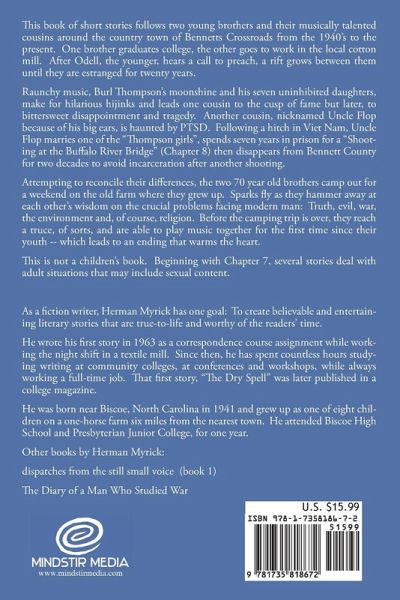 This book of short stories follows two young brothers and their musically talented cousins around the country town of Bennetts Crossroads from the 1940s to the present. One brother graduates college, the other goes to work in the local cotton mill. After Odell, the younger, hears a call to preach, a rift grows between them until they are estranged for twenty years. Raunchy music, Burl Thompson's moonshine, and his seven uninhibited daughters, make for hilarious hijinks and leads one cousin to the cusp of fame but later, to bittersweet disappointment and tragedy. Another cousin, nicknamed Uncle Flop because of his big ears, is haunted by PTSD. Following a hitch in Viet Nam, Uncle Flop marries one of the " Thompson girls", spends seven years in prison for a "Shooting at the Buffalo River Bridge" (Chapter 8) then disappears from Bennett County for two decades to avoid incarceration after another shooting. Attempting to reconcile their differences, the two 70-year-old brothers camp out for a weekend on the old farm where they grew up. Sparks fly as they hammer away at each other's wisdom on the crucial problems facing modern man: Truth, evil, war, the environment, and, of course, religion. Before the camping trip is over, they reach a truce, of sorts, and are able to play music together for the first time since their youth - which leads to an ending that warms the heart. This is not a children's book. Beginning with Chapter 7, several stories deal with adult situations that may include sexual content. As a fiction writer, Herman Myrick has one goal: To create believable and entertaining literary stories that are true-to-life and worthy of the readers' time. He wrote his first story in 1963 as a correspondence course assignment while working the night shift in a textile mill. Since then, he has spent countless hours studying writing at community colleges, at conferences and workshops, while always working a full-time job. That first story, " The Dry Spell" was later published in a college magazine. He was born near Biscoe, North Carolina in 1941 and grew up as one of eight children on a one-horse farm six miles from the nearest town. He attended Biscoe High School and Presbyterian Junior College, for one year. Other books by Herman Myrick: dispatches from the still small voice (book 1) The Diary of a Man Who Studied War