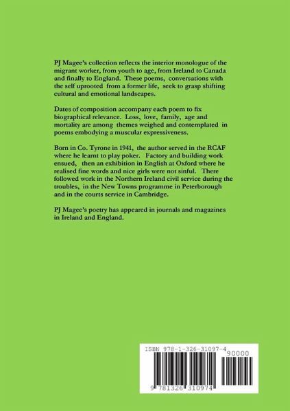 PJ Magee's collection reflects the interior monologue of the migrant worker, from youth to age, from Ireland to Canada and finally to England. These poems, conversations with the self uprooted from a former life, seek to grasp shifting cultural and emotional landscapes. Dates of composition accompany each poem to fix biographical relevance. Loss, love, family, age and mortality are among themes weighed and contemplated in poems embodying a muscular expressiveness. Born in Co. Tyrone in 1941, the author served in the RCAF where he learnt to play poker. Factory and building work ensued, then an exhibition in English at Oxford where he realised fine words and nice girls were not sinful. There followed work in the Northern Ireland civil service during the troubles, in the New Towns programme in Peterborough and in the courts service in Cambridge. PJ Magee's poetry has appeared in journals and magazines in Ireland and England.