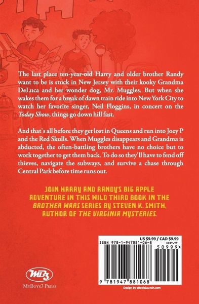 The last place ten-year-old Harry and older brother Randy want to be is stuck in New Jersey with their kooky Grandma DeLuca and her wonder dog, Mr. Muggles. But when she wakes them for a break of dawn train ride into New York City to watch her favorite singer, Neil Floggins, in concert on the Today Show, things go down hill fast. And that’s all before they get lost in Queens and run into Joey P and the Red Skulls. When Muggles disappears and Grandma is abducted, the often-battling brothers have no choice but to work together to get them back. To do so they’ll have to fend off thieves, navigate the subways, and survive a chase through Central Park before time runs out. Join Harry and Randy’s Big Apple adventure in this wild third book in the Brother Warsseries by Steven K. Smith, author of The Virginia Mysteries.