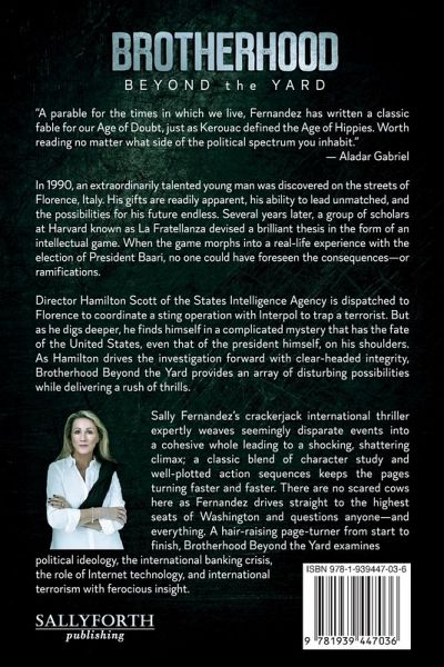 A parable for the times in which we live. Fernandez has written a classic fable for our Age of Doubt, just as Kerouac defined the Age of Hippies. Worth reading no matter what side of the political spectrum you inhabit. Aladar Gabriel. In 1990, an extraordinarily talented young man was discovered on the streets of Florence, Italy. His gifts are readily apparent, his ability to lead unmatched, and the possibilities for his future endless. Several years later, a group of scholars at Harvard known as La Fratellanza devise a brilliant thesis in the form of an intellectual game. When the game morphs into a real-life experience with the election of President Abner Baari, no one could have foreseen the consequencesor ramifications. Director Hamilton Scott of the States Intelligence Agency is dispatched to Florence to coordinate a sting operation with Interpol to trap a terrorist, but as he digs deeper, he finds himself in a complicated mystery that has the fate of the United States, even that of the president himself, on his shoulders. As Hamilton drives the investigation forward with clear-headed integrity, Brotherhood Beyond the Yard provides an array of disturbing possibilities while delivering a rush of thrills. Sally Fernandez crackerjack international thriller expertly weaves seemingly disparate events into a cohesive whole leading to a shocking, shattering climax; a classic blend of character study and well-plotted action sequences keeps the pages turning faster and faster. There are no sacred cows here as Fernandez drives straight to the highest seats of Washington and questions anyoneand everything. A hair-raising page-turner from start to finish, Brotherhood Beyond the Yard examines political ideology, the international banking crisis, the role of Internet technology, and international terrorism with ferocious insight.