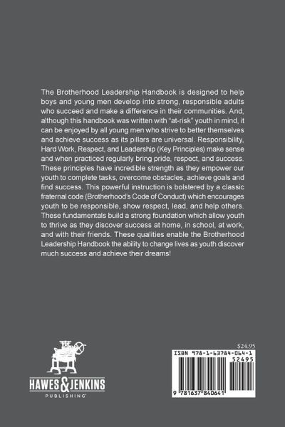 The Brotherhood Leadership Handbook is designed to help boys and young men develop into strong, responsible adults who succeed and make a difference in their communities. And, although this handbook was written with "at-risk" youth in mind, it can be enjoyed by all young men who strive to better themselves and achieve success as its pillars are universal. Responsibility, Hard Work, Respect, and Leadership (Key Principles) make sense and when practiced regularly bring pride, respect, and success. These principles have incredible strength as they empower our youth to complete tasks, overcome obstacles, achieve goals and find success. This powerful instruction is bolstered by a classic fraternal code (Brotherhood's Code of Conduct) which encourages youth to be responsible, show respect, lead, and help others. These fundamentals build a strong foundation which allow youth to thrive as they discover success at home, in school, at work, and with their friends. These qualities enable the Brotherhood Leadership Handbook the ability to change lives as youth discover much success and achieve their dreams! 2