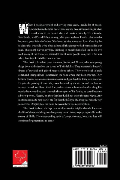 When I was incarcerated and serving three years, I read a lot of books. Donald Goins became my favorite author because his writing is what I could relate to the most. I also read books written by Terry Woods, Sista Soulja, and David Fisher, among other great authors. I had a cellmate who became a good friend of mine. We shared stories about our lives. One day he told me that we could write a book about all the crimes we had witnessed in our lives. That night I lay in my bed, thinking to myself that of all the books I've read, many of the characters reminded me of some people in my life. That was when I realized I could become a writer. This book is based on two characters, Kevin, and Akeem, who were young thugs born and raised on the streets of Philadelphia. They mastered a hustler's dream of survival and gained respect from others. They were loyal to each other, and their goal was to succeed in the hood where they both grew up. They became cocaine dealers, marijuana smokers, and gun holders. They were outlaws. Despite the passing of time, they were haunted by the streets, and the lust for money caused lost lives. Kevin's experiences made him realize that thug life wasn't the way to live, and through the support of his family, he could become a better person. Akeem, on the other hand, did not share the same views. Any misfortunes made him worse. He felt that the lifestyle of a thug was his only way to succeed. Despite this, the bond between them was never broken. This book is about the experiences of inner-city neighborhoods. It's about the life of thugs and the game that young teens choose to play, especially in the streets of Philly. The never-ending cycle of drugs, violence, love, and loss will continue for generations to come.