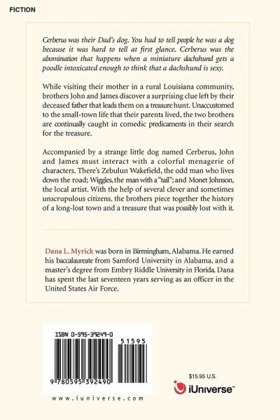 Cerberus was their Dad's dog. You had to tell people he was a dog because it was hard to tell at first glance. Cerberus was the abomination that happens when a miniature dachshund gets a poodle intoxicated enough to think that a dachshund is sexy. While visiting their mother in a rural Louisiana community, brothers John and James discover a surprising clue left by their deceased father that leads them on a treasure hunt. Unaccustomed to the small-town life that their parents lived, the two brothers are continually caught in comedic predicaments in their search for the treasure. Accompanied by a strange little dog named Cerberus, John and James must interact with a colorful menagerie of characters. There's Zebulun Wakefield, the odd man who lives down the road; Wiggles, the man with a "tail"; and Monet Johnson, the local artist. With the help of several clever and sometimes unscrupulous citizens, the brothers piece together the history of a long-lost town and a treasure that was possibly lost with it.