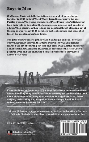 World War II B-24 crew beats the odds over Pacific waters. Brothers at Daybreak tells the intimate story of 11 boys who got together in 1944 to fight World War II from the air above the vast Pacific Ocean. The young members of Pilot Frank Jeter's flight crew took their role in defeating the Japanese one mission and one day at a time. They stuck together to face the constant threat of falling out of the sky in war- weary B-24 bombers that lost engines and ran out of fuel at the most inopportune times. The Jeter Crew's time together wasn't all tragic and sad, however. They thoroughly enjoyed their time away from war and quickly learned the art of shutting out fear and grief with a bottle of beer or a shot of whiskey. Brothers at Daybreak chronicles the Jeter Crew's postwar lives and the enduring bond of brotherhood they never allowed to loosen.