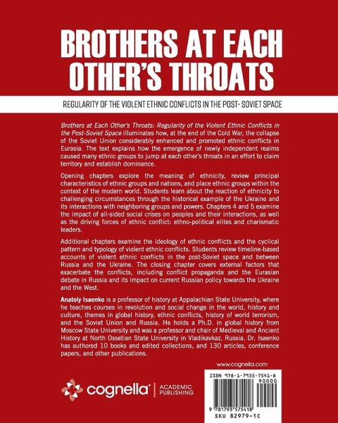 Brothers at Each Other's Throats: Regularity of the Violent Ethnic Conflicts in the Post-Soviet Space illuminates how, at the end of the Cold War, the collapse of the Soviet Union considerably enhanced and promoted ethnic conflicts in Eurasia. The text explains how the emergence of newly independent realms caused many ethnic groups to jump at each other's throats in an effort to claim territory and establish dominance. Opening chapters explore the meaning of ethnicity, review principal characteristics of ethnic groups and nations, and place ethnic groups within the context of the modern world. Students learn about the reaction of ethnicity to challenging circumstances through the historical example of the Ukraine and its interactions with neighboring groups and powers. Chapters 4 and 5 examine the impact of all-sided social crises on peoples and their interactions, as well as the driving forces of ethnic conflict: ethno-political elites and charismatic leaders. Additional chapters examine the ideology of ethnic conflicts and the cyclical pattern and typology of violent ethnic conflicts. Students review timeline-based accounts of violent ethnic conflicts in the post-Soviet space and between Russia and the Ukraine. The closing chapter covers external factors that exacerbate the conflicts, including conflict propaganda and the Eurasian debate in Russia and its impact on current Russian policy towards the Ukraine and the West.