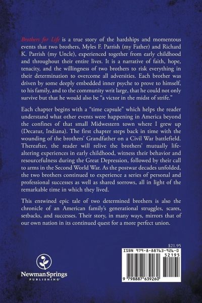Brothers for Life is a true story of the hardships and momentous events that two brothers, Myles F. Parrish (my Father) and Richard K. Parrish (my Uncle), experienced together from early childhood and throughout their entire lives. It is a narrative of faith, hope, tenacity, and the willingness of two brothers to risk everything in their determination to overcome all adversities. Each brother was driven by some deeply embedded inner psyche to prove to himself, to his family, and to the community writ large, that he could not only survive but that he would also be "a victor in the midst of strife." Each chapter begins with a "time capsule" which helps the reader understand what other events were happening in America beyond the confines of that small Midwestern town where I grew up (Decatur, Indiana). The first chapter steps back in time with the wounding of the brothers' Grandfather on a Civil War battlefield. Thereafter, the reader will relive the brothers' mutually life-altering experiences in early childhood, witness their behavior and resourcefulness during the Great Depression, followed by their call to arms in the Second World War. As the postwar decades unfolded, the two brothers continued to experience a series of personal and professional successes as well as shared sorrows, all in light of the remarkable time in which they lived. This entwined epic tale of two determined brothers is also the chronicle of an American family's generational struggles, scares, setbacks, and successes. Their story, in many ways, mirrors that of our own nation in its continued quest for a more perfect union.