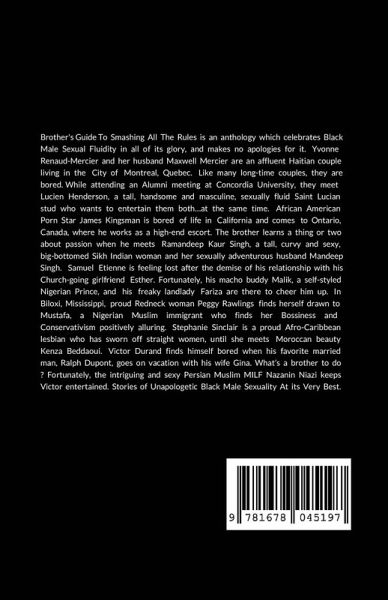 Brother's Guide To Smashing All The Rules is an anthology which celebrates Black Male Sexual Fluidity in all of its glory, and makes zero apologies for it. Yvonne Renaud-Mercier and her husband Maxwell Mercier are an affluent Haitian couple living in the City of Montreal, Quebec. While attending an Alumni meeting at Concordia University, they meet Lucien Henderson, a tall, handsome and masculine, sexually fluid Saint Lucian stud who wants to entertain them both...at the same time. African American Porn Star James Kingsman is bored of life in California and comes to Ontario, Canada, where he works as a high-end escort. The brother learns a thing or two about passion when he meets Ramandeep Kaur Singh, a tall, curvy and sexy, big-bottomed Sikh Indian woman and her sexually adventurous husband Mandeep Singh. Samuel Etienne is feeling lost after the demise of his relationship with his Church-going girlfriend Esther. Fortunately, his macho buddy Malik, a self-styled Nigerian Prince, and his freaky landlady Fariza are there to cheer him up. In Biloxi, Mississippi, proud Redneck woman Peggy Rawlings finds herself drawn to Mustafa, a Nigerian Muslim immigrant who finds her Bossiness and Conservativism positively alluring. Stephanie Sinclair is a proud Afro-Caribbean lesbian who has sworn off straight women, until she meets Moroccan beauty Kenza Beddaoui. Victor Durand finds himself bored when his favorite married man, Ralph Dupont, goes on vacation with his wife Gina. What's a brother to do ? Fortunately, the intriguing and sexy Persian Muslim MILF Nazanin Niazi keeps Victor entertained. Stories of Unapologetic Black Male Sexuality At its Very Best.