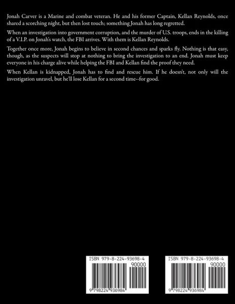 Jonah Carver is a Marine and combat veteran. He and his former Captain, Kellan Reynolds, once shared a scorching night, but then lost touch; something Jonah has long regretted. When an investigation into government corruption, and the murder of U.S. troops, ends in the killing of a V.I.P. on Jonah's watch, the FBI arrives. With them is Kellan Reynolds. Together once more, Jonah begins to believe in second chances and sparks fly. Nothing is that easy, though, as the suspects will stop at nothing to bring the investigation to an end. Jonah must keep everyone in his charge alive while helping the FBI and Kellan find the proof they need. When Kellan is kidnapped, Jonah has to find and rescue him. If he doesn't, not only will the investigation unravel, but he'll lose Kellan for a second time--for good.