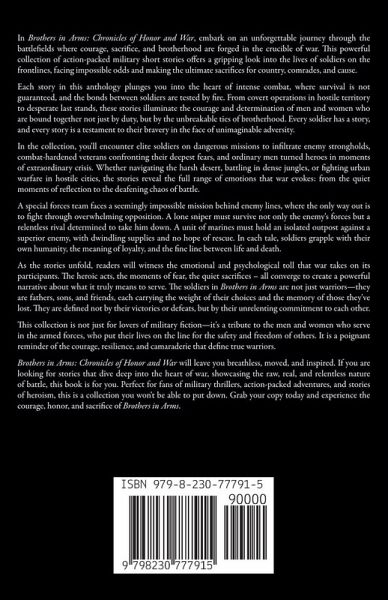 In Brothers in Arms: Chronicles of Honor and War, embark on an unforgettable journey through the battlefields where courage, sacrifice, and brotherhood are forged in the crucible of war. This powerful collection of action-packed military short stories offers a gripping look into the lives of soldiers on the frontlines, facing impossible odds and making the ultimate sacrifices for country, comrades, and cause. Each story in this anthology plunges you into the heart of intense combat, where survival is not guaranteed, and the bonds between soldiers are tested by fire. From covert operations in hostile territory to desperate last stands, these stories illuminate the courage and determination of men and women who are bound together not just by duty, but by the unbreakable ties of brotherhood. Every soldier has a story, and every story is a testament to their bravery in the face of unimaginable adversity. In the collection, you'll encounter elite soldiers on dangerous missions to infiltrate enemy strongholds, combat-hardened veterans confronting their deepest fears, and ordinary men turned heroes in moments of extraordinary crisis. Whether navigating the harsh desert, battling in dense jungles, or fighting urban warfare in hostile cities, the stories reveal the full range of emotions that war evokes: from the quiet moments of reflection to the deafening chaos of battle. A special forces team faces a seemingly impossible mission behind enemy lines, where the only way out is to fight through overwhelming opposition. A lone sniper must survive not only the enemy's forces but a relentless rival determined to take him down. A unit of marines must hold an isolated outpost against a superior enemy, with dwindling supplies and no hope of rescue. In each tale, soldiers grapple with their own humanity, the meaning of loyalty, and the fine line between life and death. As the stories unfold, readers will witness the emotional and psychological toll that war takes on its participants. The heroic acts, the moments of fear, the quiet sacrifices - all converge to create a powerful narrative about what it truly means to serve. The soldiers in Brothers in Arms are not just warriors-they are fathers, sons, and friends, each carrying the weight of their choices and the memory of those they've lost. They are defined not by their victories or defeats, but by their unrelenting commitment to each other. This collection is not just for lovers of military fiction-it's a tribute to the men and women who serve in the armed forces, who put their lives on the line for the safety and freedom of others. It is a poignant reminder of the courage, resilience, and camaraderie that define true warriors. Brothers in Arms: Chronicles of Honor and War will leave you breathless, moved, and inspired. If you are looking for stories that dive deep into the heart of war, showcasing the raw, real, and relentless nature of battle, this book is for you. Perfect for fans of military thrillers, action-packed adventures, and stories of heroism, this is a collection you won't be able to put down. Grab your copy today and experience the courage, honor, and sacrifice of Brothers in Arms.