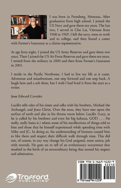 Lucifer tells tales of his times and talks with his brothers, Michael the Archangel, and Jesus Christ. Over the eons, they have met upon the surface of earth and also in his throne room below. Lucifer (Lucy, as he is called by his brethren and even his big kahuna, GOD . . . He really, really hates it.) relates some of his recollections of things told to him and those that he himself experienced while spending time with Mike and JC. In doing so, his understanding of humans caused him to like them and respect their difficult walk through time. This did not, of course, in any way change his God assigned, none union, job with mortals. He goes on to tell of an evolutionary occurrence that resulted in the birth of an extraordinary being that earned his respect and admiration.