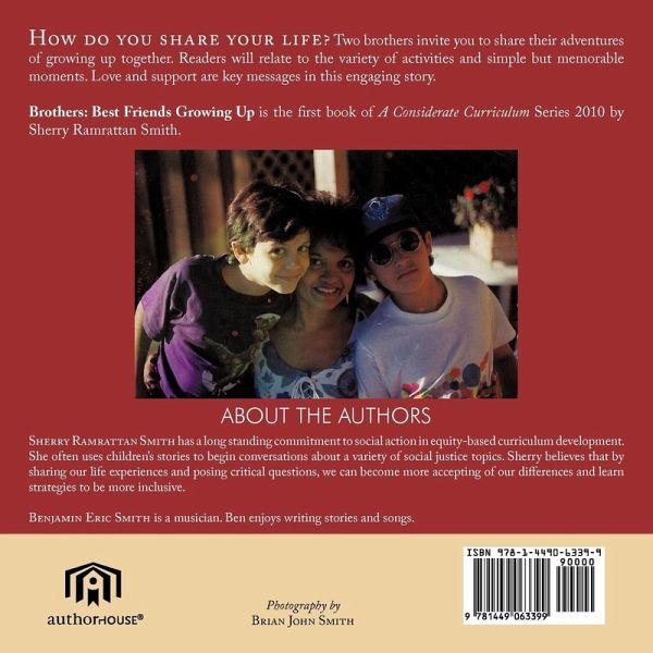 Brothers: Best Friends Growing Up How do you share your life? Two brothers invite you to share their adventures of growing up together. Readers will relate to the variety of activities and simple but memorable moments. Love and support are key messages in this engaging story. Brothers: Best Friends Growing Up is the first book of A Considerate Curriculum Series 2010 by Sherry Ramrattan Smith.