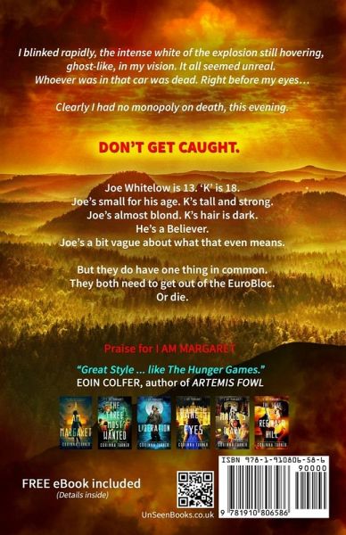 I blinked rapidly, the intense white of the explosion still hovering, ghost-like, in my vision. It all seemed unreal. Whoever was in that car was dead. Right before my eyes… Clearly I didn't have any monopoly on death, this evening. DON'T GET CAUGHT. Joe Whitelow is 13. Kyle Verrall is 18. Joe's small for his age. Kyle's tall and strong. Joe's almost blond. Kyle's hair is dark. He's a Believer. Joe's a bit vague about what that even means. But they do have one thing in common. They both need to get out of the EuroBloc. Or die.