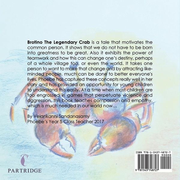 Brotino The Legendary Crab is a tale that motivates the common person. It shows that we do not have to be born into greatness to be great. Also it exhibits the power of teamwork and how this can change one's destiny, perhaps of a whole village too, or even the world. It takes one person to want to make that change and by attracting like-minded people, much can be done to better everyone's lives. Phoebe has captured these concepts really well in her story and has provided an opportunity for young children to understand this easily. At a time when most children are too engrossed in games that perpetuate violence and aggression, this book teaches compassion and empathy, which is much needed in our world now... By Velankanni Sandanasamy Phoebe's Year 5 Class Teacher 2017