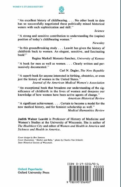 Based on personal accounts by birthing women and their medical attendants, Brought to Bed reveals how childbirth has changed from colonial times to the present. Judith Walzer Leavitt's study focuses on the traditional woman-centered home-birthing practices, their replacement by male doctors, and the movement from the home to the hospital. She explains that childbearing women and their physicians gradually changed birth places because they believed the increased medicalization would make giving birth safer and more comfortable. Ironically, because of infection, infant and maternal mortality did not immediately decline. She concludes that birthing women held considerable power in determining labor and delivery events as long as childbirth remained in the home. The move to the hospital in the twentieth century gave the medical profession the upper hand. Leavitt also discusses recent events in American obstetrics that illustrate how women have attempted to retrieve some of the traditional women--and family--centered aspects of childbirth.
