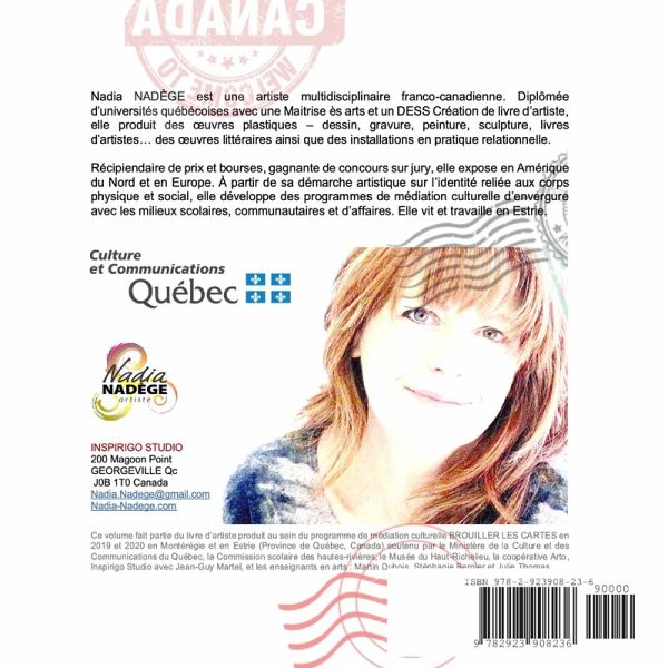 Livre d'artiste en 12 volumes par Nadia Nadège. Projet de médiation culturelle (art social) "Brouiller les cartes" réalisé avec 1.500 élèves, 15 enseignants, un Musée, une galerie d'art et les enseignants en arts de la Commission scolaire des hautes rivières (région de la Montérégie, province de Québec, Canada). L'artiste Nadia Nadège a animé 70 ateliers en classe. Les participants ont produit environ 2.000 cartes d'art postal. 5 expositions sont planifiées en 2020. Ce projet a bénéficié d'une bourse du Ministère de la culture et des communications du Québec et de l'apport en ressources humaines, logistiques et financières des partenaires. Information : nadia.nadege@gmail.com =1-514-519-5388 nadia-nadege.com