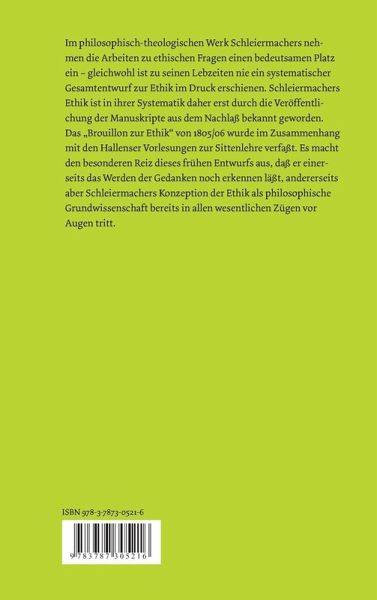 Im philosophisch-theologischen Werk Schleiermachers nehmen die Arbeiten zu ethischen Fragen einen bedeutsamen Platz ein ¿ gleichwohl ist zu seinen Lebzeiten nie ein systematischer Gesamtentwurf zur Ethik im Druck erschienen. Schleiermachers Ethik ist in ihrer Systematik daher erst durch die Veröffentlichung der Manuskripte aus dem Nachlaß bekannt geworden. Das ¿Brouillon zur Ethik¿ von 1805/06 wurde im Zusammenhang mit den Hallenser Vorlesungen zur Sittenlehre verfaßt. Es macht den besonderen Reiz dieses frühen Entwurfs aus, daß er einerseits das Werden der Gedanken noch erkennen läßt, andererseits aber Schleiermachers Konzeption der Ethik als philosophische Grundwissenschaft bereits in allen wesentlichen Zügen vor Augen tritt.