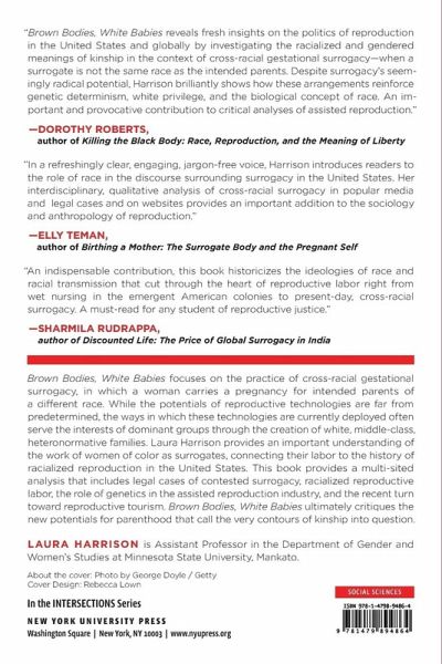 Brown Bodies, White Babies focuses on the practice of cross-racial gestational surrogacy, in which a woman - through in-vitro fertilization using the sperm and egg of intended parents or donors - carries a pregnancy for intended parents of a different race. Focusing on the racial differences between parents and surrogates, this book is interested in how reproductive technologies intersect with race, particularly when brown bodies produce white babies. While the potential of reproductive technologies is far from pre-determined, the ways in which these technologies are currently deployed often serve the interests of dominant groups, through the creation of white, middle-class, heteronormative families. Laura Harrison, providing an important understanding of the work of women of color as surrogates, connects this labor to the history of racialized reproduction in the United States. Cross-racial surrogacy is one end of a continuum in which dominant groups rely on the reproductive potential of nonwhite women, whose own reproductive desires have been historically thwarted and even demonized. Brown Bodies, White Babies provides am interdisciplinary analysis that includes legal cases of contested surrogacy, historical examples of surrogacy as a form of racialized reproductive labor, the role of genetics in the assisted reproduction industry, and the recent turn toward reproductive tourism. Joining the ongoing feminist debates surrounding reproduction, motherhood, race, and the body, Brown Bodies, White Babies ultimately critiques the new potentials for parenthood that put the very contours of kinship into question.