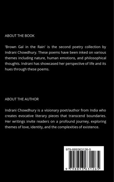 'Brown Gal in the Rain' is the second poetry collection by Indrani Chowdhury. These poems have been inked on various themes including nature, human emotions, and philosophical thoughts. Indrani has showcased her perspective of life and its hues through these poems.