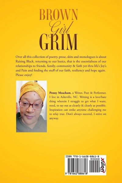 Over all this collection of poetry, prose, skits and monologues is about Raising Black, returning to our basics, that is the essentialness of our relationships to friends, family, community & faith yet thru life's Joy's and Pain and finding the stuff of our faith, resiliency and hope again. Please enjoy! Penny Meacham, a Writer, Poet & Performer. I live in Asheville, NC. Writing is a love/hate thing wherein I struggle to get what I want, need, to say out as cleanly & clearly as possible. Inspiration can strike anytime challenging me to relay true. Don't always succeed, I strive on anyway.