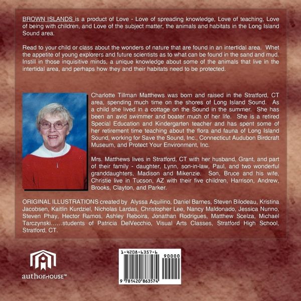 BROWN ISLANDS is a product of Love - Love of spreading knowledge, Love of teaching, Love of being with children, and Love of the subject matter, the animals and habitats in the Long Island Sound area. Read to your child or class about the wonders of nature that are found in an intertidal area. Whet the appetite of young explorers and future scientists as to what can be found in the sand and mud. Instill in those inquisitive minds, a unique knowledge about some of the animals that live in the intertidal area, and perhaps how they and their habitats need to be protected.