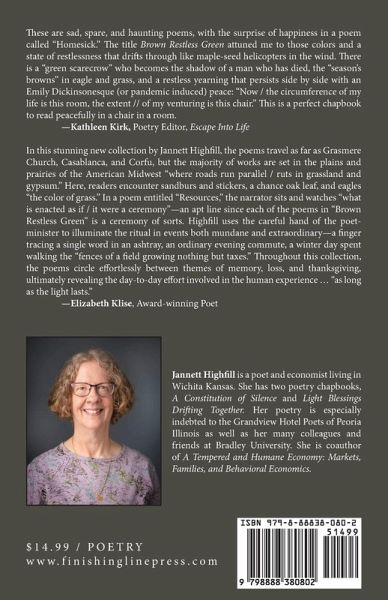 These poems move from morning coffee to a green sunset, often through brown winter prairie and just once Lake District daffodils. Brown Restless Green moves from the tensions of work and marriage to the letting go of farmland, often through loss, and just once homesickness and happiness.