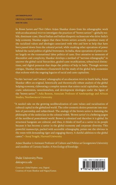 In Brown Saviors and Their Others Arjun Shankar draws from his ethnographic work with an educational NGO to investigate the practices of “brown saviors”-globally mobile, dominant-caste, liberal Indian and Indian diasporic technocrats who drive India’s help economy. Shankar argues that these brown saviors actually reproduce many of the racialized values and ideologies associated with who and how to help that have been passed down from the colonial period, while masking other operations of power behind the racial politics of global brownness. In India, these operations of power center largely on the transnational labor politics of caste. Ever attentive to moments of discomfort and complicity, Shankar develops a method of “nervous ethnography” to uncover the global racial hierarchies, graded caste stratifications, urban/rural distinctions, and digital panaceas that shape the politics of help in India. Through nervous critique, Shankar introduces a framework for the study of the global help economies that reckons with the ongoing legacies of racial and caste capitalism.