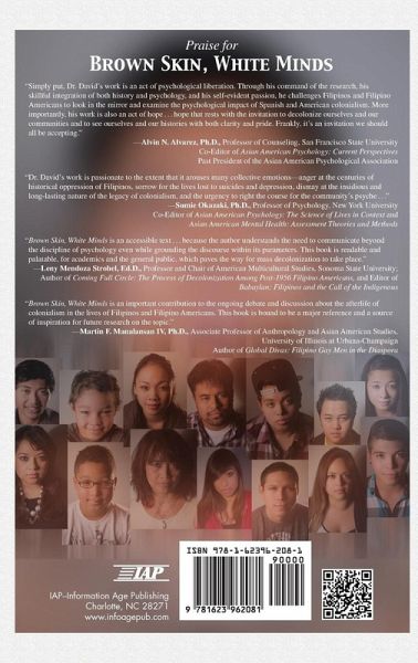Filipino Americans have a long and rich history with and within the United States, and they are currently the second largest Asian group in the country. However, very little is known about how their historical and contemporary relationship with America may shape their psychological experiences. The most insidious psychological consequence of their historical and contemporary experiences is colonial mentality or internalized oppression. Some common manifestations of this phenomenon are described below: ¿Skin-whitening products are used often by Filipinos in the Philippines to make their skins lighter. Skin whitening clinics and businesses are popular in the Philippines as well. The "beautiful" people such as actors and other celebrities endorse these skin-whitening procedures. Children are told to stay away from the sun so they do not get "too dark." Many Filipinos also regard anything "imported" to be more special than anything "local" or made in the Philippines. ¿In the United States, many Filipino Americans make fun of "fresh-off-the-boats" (FOBs) or those who speak English with Filipino accents. Many Filipino Americans try to dilute their "Filipino-ness" by saying that they are mixed with some other races. Also, many Filipino Americans regard Filipinos in the Philippines, and pretty much everything about the Philippines, to be of "lower class" and those of the "third world." The historical and contemporary reasons for why Filipino -/ Americans display these attitudes, beliefs, and behaviors - often referred to as colonial mentality - are explored in Brown Skin, White Minds. This book is a peer-reviewed publication that integrates knowledge from multiple scholarly and scientific disciplines to identify the past and current catalysts for such self-denigrating attitudes and behaviors. It takes the reader from indigenous Tao culture, Spanish and American colonialism, colonial mentality or internalized oppression along with its implications on Kapwa, identity, and mental health, to decolonization in the clinical, community, and research settings. This book is intended for the entire community - teachers, researchers, students, and service providers interested in or who are working with Filipinos and Filipino Americans, or those who are interested in the psychological consequences of colonialism and oppression. This book may serve as a tool for remembering the past and as a tool for awakening to address the present.