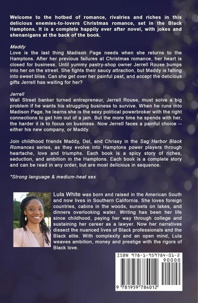 Welcome to the hotbed of romance, rivalries and riches in this delicious enemies-to-lovers Christmas romance, set in the Black Hamptons. It is a complete happily ever after novel, with jokes and shenanigans at the back of the book. Maddy Love is the last thing Madison Page needs when she returns to the Hamptons. After her previous failures at Christmas romance, her heart is closed for business. Until yummy pastry-shop owner Jerrell Rouse bumps into her on the street. She fights their saucy attraction, but Maddy is falling into sweet bliss. Can she get over her painful past, and accept the delicious gifts Jerrell has waiting for her? Jerrell Wall Street banker turned entrepreneur, Jerrell Rouse, must solve a big problem if he wants his struggling business to survive. When he runs into Madison Page, he learns she is the sexy political powerbroker with the right connections to get him out of a jam. But the more time he spends with her, the harder it is to focus on business. Now Jerrell faces a painful choice -- either his new company, or Maddy. Join childhood friends Maddy, Del, and Chrissy in the Sag Harbor Black Romances series, as they evolve into Hamptons power players through heartache, love and triumphs. Each book is a spicy story of riches, seduction, and ambition in the Hamptons. Each book is a complete story and can be read in any order, but are most delicious in sequence. *Strong language & medium-heat sex