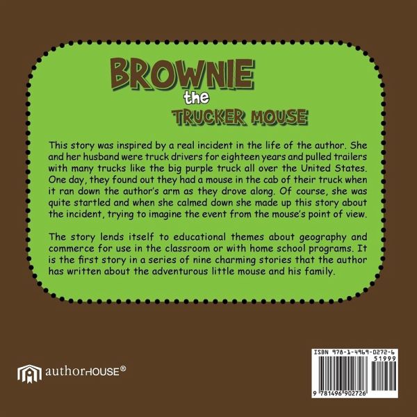 This story was inspired by a real incident in the life of the author. She and her husband were truck drivers for eighteen years and hauled trailers with a big, purple truck all over the United States. One day, they found out they had a mouse in the cab of their truck when it ran down the author's arm as they drove along. Of course, she was quite startled and when she calmed down she made up this story about the incident, trying to imagine the event from the mouse's point of view. The attached proposal has some rough sketches of how the book might be illustrated to go along with the story and an idea at the end for how to use it as a teaching tool. The story lends itself to educational themes about geography and commerce for use in the classroom or with home school programs. It is the first story in a series of nine charming stories that the author has written about the adventurous little mouse and his family.