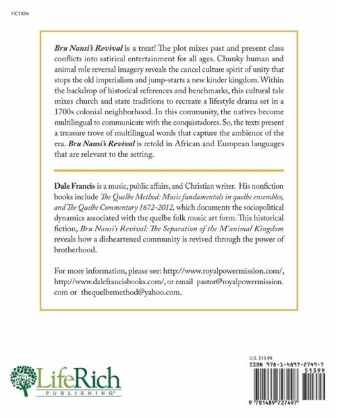 Bru Nansi's Revival is a treat! The plot mixes past and present class conflicts into satirical entertainment for all ages. Chunky human and animal role reversal imagery reveals the cancel culture spirit of unity that stops the old imperialism and jump-starts a new kinder kingdom. Within the backdrop of historical references and benchmarks, this cultural tale mixes church and state traditions to recreate a lifestyle drama set in a 1700s colonial neighborhood. In this community, the natives become multilingual to communicate with the conquistadores. So, the texts present a treasure trove of multilingual words that capture the ambience of the era. Bru Nansi's Revival is retold in African and European languages that are relevant to the setting.
