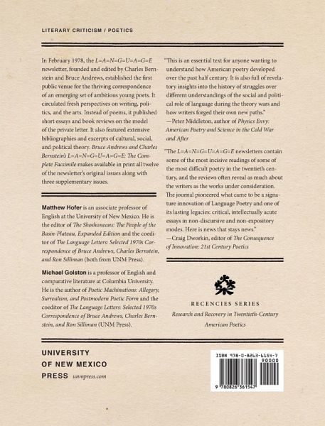 In February 1978, the L=A=N=G=U=A=G=E newsletter, founded and edited by Charles Bernstein and Bruce Andrews, established the first public venue for the thriving correspondence of an emerging set of ambitious young poets. It circulated fresh perspectives on writing, politics, and the arts. Instead of poems, it published short essays and book reviews on the model of the private letter. It also featured extensive bibliographies and excerpts of cultural, social, and political theory. Bruce Andrews and Charles Bernstein's L=A=N=G=U=A=G=E: The Complete Facsimile makes available in print all twelve of the newsletter's original issues along with three supplementary issues.