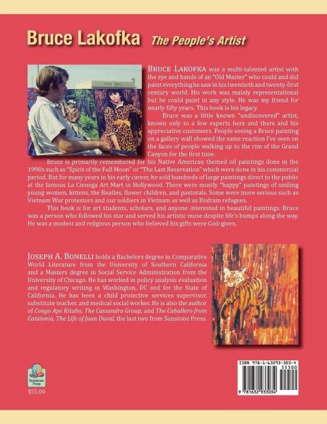 Bruce Lakofka was a multi-talented artist with the eye and hands of an "Old Master" who could and did paint everything he saw in his twentieth and twenty-first century world. His work was mainly representational but he could paint in any style. He was my friend for nearly fifty years. This book is his legacy. Bruce was a little known "undiscovered" artist, known only to a few experts here and there and his appreciative customers. People seeing a Bruce painting on a gallery wall showed the same reaction I’ve seen on the faces of people walking up to the rim of the Grand Canyon for the first time. Bruce is primarily remembered for his Native American themed oil paintings done in the 1990s such as "Spirit of the Full Moon" or "The Last Reservation" which were done in his commercial period. But for many years in his early career, he sold hundreds of large paintings direct to the public at the famous La Cienega Art Mart in Hollywood. There were mostly "happy" paintings of smiling young women, kittens, the Beatles, flower children, and pastorals. Some were more serious such as Vietnam War protestors and our soldiers in Vietnam as well as Biafram refugees. This book is for art students, scholars, and anyone interested in beautiful paintings. Bruce was a person who followed his star and served his artistic muse despite life’s bumps along the way. He was a modest and religious person who believed his gifts were God-given.