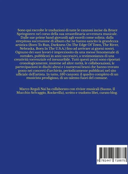 Sono qui raccolte le traduzioni di tutte le canzoni incise da Bruce Springsteen nel corso della sua straordinaria avventura musicale. Dalle sue prime band giovanili agli esordi come solista; dalla strepitosa successione di album che ne hanno sancito la grandezza artistica (Born To Run, Darkness On The Edge Of Town, The River, Nebraska, Born In The U.S.A.) fino ad arrivare ai giorni nostri. Ognuno dei suoi lavori è impreziosito da una messe fenomenale di outtakes, pubblicati in anni successivi, a testimonianza di una creatività torrenziale ed inesauribile. Tutti questi pezzi sono riportati cronologicamente, insieme ad altre rarità, le collaborazioni, le partecipazioni in dischi altrui e i numerosi brani che hanno trovato posto nei concerti d'archivio periodicamente pubblicati nel sito ufficiale dell'artista. In tutto, 530 canzoni: il quadro completo di un musicista prodigioso, di un talento fuori del comune. Marco Regali Nai ha collaborato con riviste musicali (Suono, Il Mucchio Selvaggio, Rockerilla), scritto e tradotto libri, curato blog.