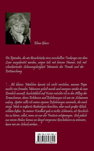 Die Episoden, die wie Bruchstücke eines zerschellten Tonkruges vor dem Leser ausgebreitet werden, zeigen teils mit feinem Humor, teils mit schockierender Schonungslosigkeit Momente der Freude und der Enttäuschung. " . . . Als kleines Mädchen konnte ich nicht verstehen, warum Papa nachts von fremden Männern geholt wurde und morgens wieder da war. Ziemlich unsanft, buchstäblich auf Knien rutschte ich in den Alltag der Erwachsenen, deren Erlebnisse und Erfahrungen ich wie ein Schwamm aufsog. Später sollte ich meine eigenen Erfahrungen sammeln, die mich einige Male in äußerste Bedrängnis brachten, aber auch großes Glück erleben ließen. In meiner Kindheit gab es nichts Schöneres, als Geschichten zu hören, selbst, wenn sie nur der Fantasie entsprangen. Sich jedoch aus einem Anlass heraus an längst vergessene Geschehnisse zu erinnern, kann wie ein Schock wirken".