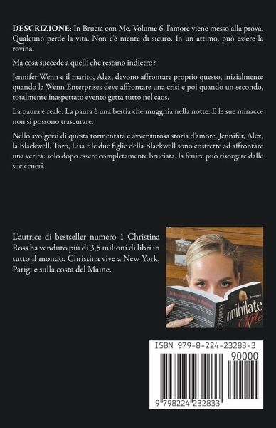 La serie Brucia con Me continua con i volumi 6 - Holiday Edition 2 e, ancora una volta, troverai tutto ciò che ti ha incuriosito in questa serie più venduta a livello internazionale: amore, umorismo e suspense. Il tutto portato a livelli impensabili! Questi volumi rappresentano il meglio della serie Brucia con Me! DESCRIZIONE: In Brucia con Me, Volume 6, l'amore viene messo alla prova. Qualcuno perde la vita. Non c'è niente di sicuro. In un attimo, può essere la rovina. Ma cosa succede a quelli che restano indietro? Jennifer Wenn e il marito, Alex, devono affrontare proprio questo, inizialmente quando la Wenn Enterprises deve affrontare una crisi e poi quando un secondo, totalmente inaspettato evento getta tutto nel caos. La paura è reale. La paura è una bestia che mugghia nella notte. E le sue minacce non si possono trascurare. Nello svolgersi di questa tormentata e avventurosa storia d'amore, Jennifer, Alex, la Blackwell, Toro, Lisa e le due figlie della Blackwell sono costrette ad affrontare una verità: solo dopo essere completamente bruciata, la fenice può risorgere dalle sue ceneri.