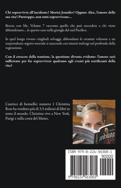 Chi sopravvivrà all'incidente? Morirà Jennifer? Oppure Alex, l'amore della sua vita? Purtroppo, non tutti sopravvivono... Brucia con Me, Volume 7 racconta quello che può succedere a chi viene abbandonato... in questo caso nella giungla del sud Pacifico. In quel luogo vivono cinghiali selvaggi, abbondano le creature velenose e un sorprendente segreto mortale si nasconde con intenti malvagi nel profondo della vegetazione. Con il crescere della tensione, la questione diventa evidente: l'amore sarà sufficiente per far sopravvivere qualcuno agli eventi più terrificanti della vita? ORDINE DI LETTURA: BRUCIA CON ME, VOLUMI 1-HOLIDAY EDITION LIBERAMI, VOLUMI 1-3 BRUCIA CON ME, VOLUMI 6-8 BRUCIA CON ME: HOLIDAY EDITION, 2 RAPITA DA TE BRUCIA CON ME: VENDETTA BRUCIA CON ME: HOLIDAY EDITION, 3 LIBERAMI: MATRIMONIO UN NATALE IN STILE BLACKWELL ROMANZI IN VOLUME UNICO: CHANCE RAPITA DA TE PERSA SENZA TE PERSA IN TE