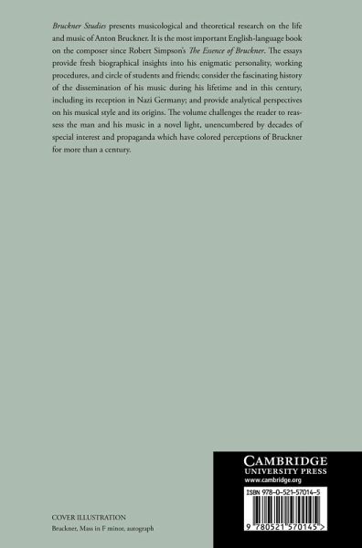 Bruckner Studies, first published in 1997, presents musicological and theoretical research on the life and music of Anton Bruckner. It is one of the most important English-language books on the composer since Robert Simpson's The Essence of Bruckner. The essays provide fresh biographical insights into his enigmatic personality, working procedures, and circle of students and friends; consider the fascinating history of the dissemination of his music during his lifetime and in this century, including its reception in Nazi Germany; and provide analytical perspectives on his musical style and its origins. The volume challenges the reader to reassess the man and his music in a fresh light, unencumbered by decades of special interest and propaganda which have coloured perceptions of Bruckner for more than a century.