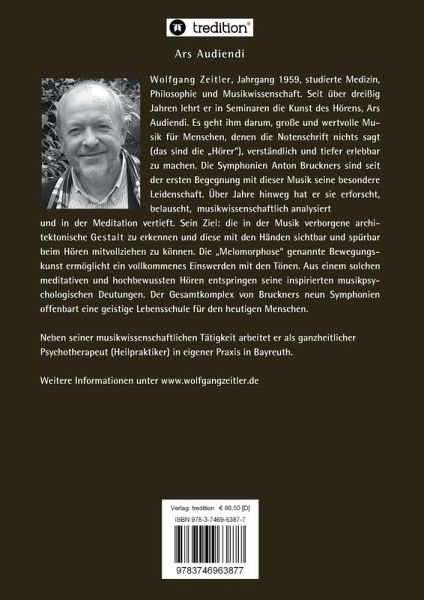 Wolfgang Zeitler, geb. 1959, studierte Medizin und Philosophie und arbeitete nach einer musikwissenschaftlichen Ausbildung viele Jahre als Musiktherapeut in der neurologischen Frührehabilitation mit Wachkoma-Patienten, später auf einer Palliativstation. Zahlreiche Weiterbildungen im Bereich ganzheitliche Psychotherapie, metaphysische und schamanische Heilweisen. Seit 2002 eigene Heilpraxis (Heilpraktiker Psychotherapie) in Bayreuth. Mit Wissen und Erfahrung formte er die Heilkunst des Hörens, Ars Audiendi. Er leitet seit 1985 Seminare zur Aukimo-Musikmeditation, audio-kinetische Modulation. Aus den Offenbarungen der Musik entspringt sein Herzensanliegen, die Menschen wieder zu einem tieferen Erleben und Erkennen der großen, inspirierten Musik zu führen. Für ihn spricht durch solche Töne die göttliche SOPHIA. Musik ist die reinste Sprache des Geistes und braucht nicht übersetzt zu werden! Es ist aber notwendig, das Ohr zu öffnen, das wirkliche Hören zu lernen und zu üben. Mittels der Melomorphose wird die feinstoffliche Gestalt eines Musikstückes körperlich erfahrbar. Erst wenn der Körper beteiligt ist, wird Geistiges zur erlebbaren Wirklichkeit. Die Musik selbst verbindet mit der göttlichen Quelle. Der Autor blickt inzwischen auf 40 Jahre spirituelle Entwicklung und Wahrnehmung der Musik in der Gesellschaft. Dabei wird deutlich, wie raffiniert die Menschen von einem solchen Zugang zu inspirierter Musik ferngehalten werden. Es ist heute völlig "out", Klassische Musik als etwas hoch Spirituelles anzusehen. Uralte Klangphänomene, wie Klangschalen, Gongs und Obertongesang, gelten in spirituellen Kreisen als Nonplusultra. Dies ist Musik aus den archaischen, magischen und mythischen Bewusstseinsepochen. Doch die Menschheit hat sich weiterentwickelt. Aktuell leben wir am Ende der rationalen Bewusstseinsepoche, und am Beginn eines neuen, integralen Bewusstseins. Aus der Akasha-Chronik ist bekannt, dass in der Musik, die in der rationalen Bewusstseinsepoche auf die Erde kommt, hochschwingende Informationsmuster feinstofflich gespeichert sind. Diese Schwingungsmuster sollen den Menschen in seiner Entwicklung zum neuen Bewusstsein unterstützen und den alten Menschen heilen. Der Autor will Menschen ermutigen, Herz und Verstand und Körper gleichzeitig zu benutzen und die eigenen sogenannten übersinnlichen Fähigkeiten wie selbstverständlich zu integrieren. Weitere Informationen unter www.wolfgangzeitler.de