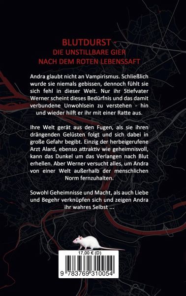 VAMPIRE URBAN FANTASY BLUTDURST - DIE UNSTILLBARE GIER NACH DEM ROTEN LEBENSSAFT Andra glaubt nicht an Vampirismus. Schließlich wurde sie niemals gebissen, dennoch fühlt sie sich fehl in dieser Welt. Nur ihr Stiefvater Werner scheint dieses Bedürfnis und das damit verbundene Unwohlsein zu verstehen - hin und wieder hilft er ihr mit einer Ratte aus. Ihre Welt gerät aus den Fugen, als sie ihren drängenden Gelüsten folgt und sich dabei in große Gefahr begibt. Einzig der herbeigerufene Arzt Alard, ebenso attraktiv wie geheimnisvoll, kann das Dunkel um das Verlangen nach Blut erhellen. Aber Werner versucht alles, um Andra von einer Welt außerhalb der menschlichen Norm fernzuhalten. Sowohl Geheimnisse und Macht, als auch Liebe und Begehr verknüpfen sich und zeigen Andra ihr wahres Selbst ...