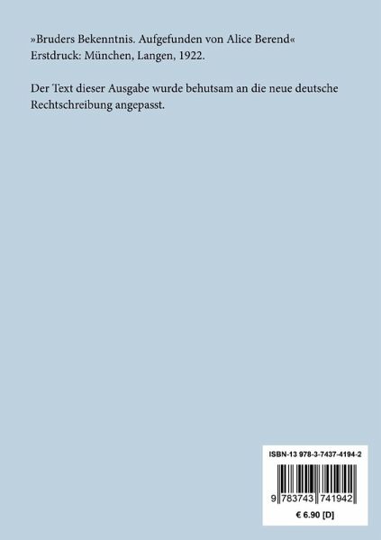 Alice Berend: Bruders Bekenntnis. Ein Dobermann erzählt seine Lebensgeschichte»Bruders Bekenntnis. Aufgefunden von Alice Berend«. Erstdruck: München, Langen, 1922.Neuausgabe, herausgegeben von Karl-Maria Guth, Berlin 2023.Der Text dieser Ausgabe wurde behutsam an die neue deutsche Rechtschreibung angepasst.Umschlagabbildung: Carl Reichert, Porträt eines Dobermanns, 1916Gesetzt aus der Minion Pro, 11 pt.Die Sammlung Hofenberg erscheint im Verlag Henricus - Edition Deutsche Klassik GmbH, Berlin