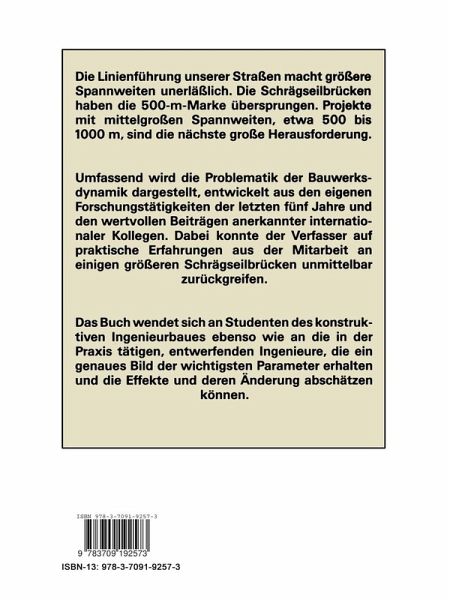 Auf der Basis der eigenen Forschungstätigkeit in den letzten fünf Jahren und der wertvollen Beiträge anerkannter internationaler Kollegen wird die Problematik der Bauwerksdynamik umfassend dargestellt. Dabei konnte der Autor auf seine reiche praktische Erfahrung aus der Mitarbeit an einigen größeren Schrägseilbrücken unmittelbar zurückgreifen.